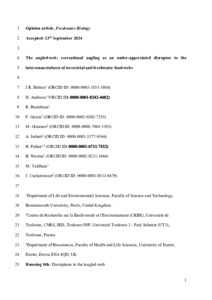 Britton, J. R., Andreou, D., Boardman, R., Gimenez, G. M., Imbert, A., Parker, B., Warren, B., Yeldham, M. I. A. and Cucherousset, J., 2024. The angled-web: recreational angling as an under-appreciated disruptor to the interconnectedness of terrestrial and freshwater food-webs. Freshwater Biology, 69 (12), 1739-1747.