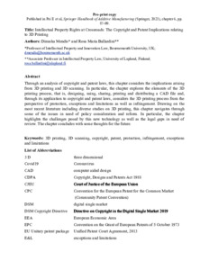 Mendis, D. and Ballardini, R., 2023. Intellectual Property Rights at Crossroads: The Copyright and Patent Implications relating to 3D Printing. In: Pei, E., Bernard, A., Gu, D., Klahn, C., Monzón, M., Petersen, M. and Sun, T., eds. Springer Handbook of Additive Manufacturing. Berlin: Springer, 87-99.