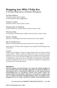 Matthews, M. R., Jenkins, C. A., Janse van Rensburg, M., Brady, M. J., Moseley, R. L. and Gamble-Turner, J. M., 2025. Stepping Into Who I Fully Am: A Creative Exploration of Autistic Menopause. International Journal of Disability and Social Justice, 5 (1), 76-105.