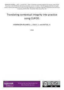 Henriksen-Bulmer, J., Faily, S. and Katos, V., 2018. Translating Contextual Integrity into Practice using CLIFOD. In: 21st ACM Conference on computer-supported cooperative work and social computing (CSCS 2018), 3 Nov 2018, Jersey City, USA. (Unpublished)