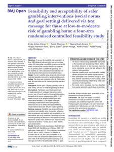 Arden-Close, E., Thomas, S., Bush-Evans, R., Hamson-Ford, A., Bolat, E., Hodge, S., Phalp, K., Wang, R. and McAlaney, J., 2025. Feasibility and acceptability of safer gambling interventions (social norms and goal setting) delivered via text message for those at low-to-moderate risk of gambling harm: a four-arm randomised controlled feasibility study. BMJ Open, 15 (10), e104784.