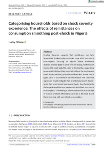 Otame, L., 2023. Categorising households based on shock severity experience: The effects of remittances on consumption smoothing post-shock in Nigeria. Journal of International Development, 35 (8), 2535-2551.