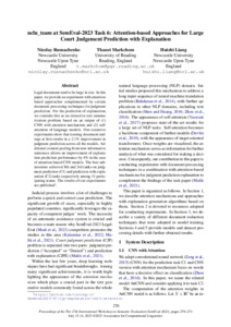 Rusnachenko, N., Markchom, T. and Liang, H., 2023. nclu_team at SemEval-2023 Task 6: Attention-based Approaches for Large Court Judgement Prediction with Explanation. In: Proceedings of the 17th International Workshop on Semantic Evaluation (SemEval-2023). Association for Computational Linguistics (ACL), 270-274.