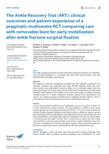 Martin, R., Docherty, S., Heaslip, V., Allen, H., Tbaily, L. W., Hayward, C. J., Marques, E. M. R. and Sangar, A., 2025. The Ankle Recovery Trial (ART): clinical outcomes and patient experience of a pragmatic multicentre RCT comparing cast with removable boot for early mobilization after ankle fracture surgical fixation. Bone & Joint Open, 6 (11), 1416-1424.