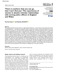 Sweeting, F. and Mulvihill, N., 2025. ‘There is nowhere that you can go, that I can’t find you’: The experiences of women in abusive intimate relationships with serving police officers in England and Wales. International Journal of Police Science and Management, 27 (4), 406-423.