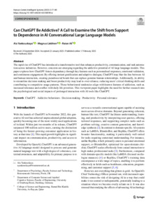 Yankouskaya, A., Liebherr, M. and Ali, R., 2025. Can ChatGPT Be Addictive? A Call to Examine the Shift from Support to Dependence in AI Conversational Large Language Models. Human-Centric Intelligent Systems, 5 (1), 77-89.