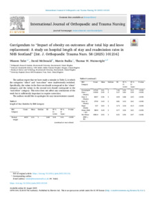 Tafat, W., McDonald, D., Budka, M. and Wainwright, T. W., 2025. Corrigendum to “Impact of obesity on outcomes after total hip and knee replacement: A study on hospital length of stay and readmission rates in NHS Scotland” [Int. J. Orthopaedic Trauma Nurs. 58 (2025) 101216] (International Journal of Orthopaedic and Trauma Nursing (2025) 58, (S1878124125000619), (10.1016/j.ijotn.2025.101216)). International Journal of Orthopaedic and Trauma Nursing, 59, 101218.