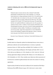 Notational analysis research to date has often overlooked Youth football, predominantly examining First teams in elite competitions. As a result, the current study aims to compare performance between U16s, U18s and First teams. 3311 final third entries were analysed over the course of 45 matches, equally distributed across three age-groups, during the 2018–2019 season. The sample consisted of 10 U16 teams, 16 U18 teams and 16 First teams. The study found that there were significant differences in playing styles across the age groups. As experience increases, there is a tendency of more wing than central attacks, more forward-diagonal movements, more crosses, but fewer shooting opportunities due to developments in defence abilities. The differences in the patterns of play across the age groups, suggests that younger players are more independently focused when attempting to breakdown their opposition’s defence, with older teams using space more effectively and more team focused.