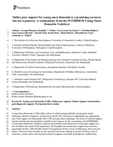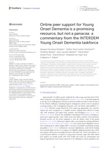 Kafadar, A. H., Loseto-Gerritzen, E. V., Bakker, C., Bartels, S. L., Neal, D., Poos, J., Ritzen, M., de Vugt, M. and Talbot, C. V., 2025. Online peer support for Young Onset Dementia is a promising resource, but not a panacea: A commentary from the INTERDEM Young Onset Dementia Taskforce. Frontiers in Dementia, 4, 1722518.