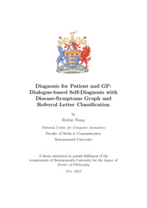 Wang, R., 2024. Diagnosis for Patient and GP: Dialogue-based Self-Diagnosis with Disease-Symptoms Graph and Referral Letter Classification. Doctoral Thesis (Doctoral). Bournemouth University.