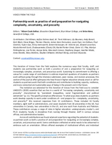 Kane, B., Cook-Sather, A., Wong, M., Bauman, L., Fellows, I., Benoit, A., Allman, Z., Gratrick, P., Hemsworth, K., Polkinghorne, M., Oti, C., Dyer, L., Veuger, S., Chavira, T., Wardle, A., Asad, H., Lee, W. V., Derounian, J. G., Porter, L., Wheeler, S., Watkins, M., Loveman, E., Wade, H., Morrell-Scott, N., Guo, Y., Karaceper, S., Parker-Strak, R., Atkinson, W. T., Pike, C. V. S., Briggs, S., Wysocka, S., Satia, A., Black, K. and Usman, M., 2025. Partnership work as practice of and preparation for navigating complexity, uncertainty, and precarity. International Journal for Students as Partners, 9 (2), 293-309.