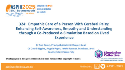 Baron, S., Paget, A., Biggins, D. and Rossner, J., 2025. Empathic care of a person with cerebral palsy: Raising awareness through co-produced educational videos and e-simulation informed by real-life experience. In: ASPiH, 11-14 November 2025, Bournemouth, UK.