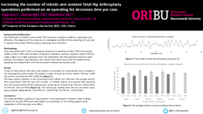 Pagkalos, J., Wainwright, T. W. and Middleton, R., 2021. Increasing the number of robotic-arm assisted total hip arthroplasty operations performed on an operating list decreases time per case. In: 14th Congress of the European Hip Society 2020, 10-11 September 2021, Lille, France.