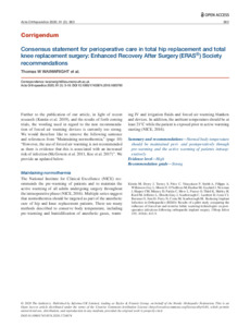 Further to the publication of our article, in light of recent research (Kumin et al. 2019), and the results of forth coming trials, the wording used in regard to the non recommendation of forced air warming devices is currently too strong. We would therefore like to remove the following sentence and references from “Maintaining normothermia,” (page 10) “However, the use of forced air-warming is not recommended as there is evidence that this is associated with an increased risk of infection (McGovern et al. 2011, Koc et al. 2017)”. We provide an updated below. Maintaining normothermia The National Institute for Clinical Excellence (NICE) recommends the pre-warming of patients and to maintain the active warming of all adults undergoing surgery throughout the intraoperative phase (NICE, 2016). Multiple series suggest that normothermia should be targeted as part of the anesthetic care of hip and knee replacement patients. There are many methods described to conserve body temperature, including pre-warming and humidification of anesthetic gases, warming IV and irrigation fluids and forced air warming blankets and devices. In addition, the ambient temperature should be at least 21°C while the patient is exposed prior to active warming starting (NICE, 2016). Summary and recommendations—Normal body temperature should be maintained peri- and postoperatively through pre-warming and the active warming of patients intraoperatively Evidence level—High Recommendation grade—Strong Kümin M, Deery J, Turney S, Price C, Vinayakam P, Smith A, Filippa A, Wilkinson-Guy L, Moore F, O’Sullivan M, Dunbar M, Gaylard J, Newman J, Harper CM, Minney D, Parkin C, Mew L, Pearce O, Third K, Shirley H, Reed M, Jefferies L, Hewitt-Gray J, Scarborough C, Lambert D, Jones CI, Bremner S, Fatz D, Perry N, Costa M, Scarborough M.. Reducing Implant Infection in Orthopaedics (RIIiO): Results of a pilot study comparing the influence of forced air and resistive fabric warming technologies on postoperative infections following orthopaedic implant surgery. J Hosp Infect 219; 103(4): 412-9.