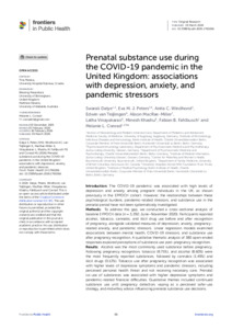 INTRODUCTION: The COVID-19 pandemic was associated with high levels of depression and anxiety among pregnant individuals in the UK, as shown previously in the EPPOCH cohort. However, the relationships between these psychological burdens, pandemic-related stressors, and substance use in the prenatal period have not been systematically investigated. METHODS: To address this gap, we conducted a cross-sectional analysis of baseline EPPOCH data (n = 3,292; June-November 2020). Participants reported alcohol, tobacco, cannabis, and illicit drug use before and after recognition of pregnancy, alongside validated measures of depression, anxiety, pregnancy-related anxiety, and pandemic stressors. Linear regression models examined associations between mental health, COVID-19 stressors, and substance use after pregnancy recognition. A qualitative thematic analysis of 380 open-ended responses explored perceptions of substance use post-pregnancy recognition. RESULTS: Alcohol was the most commonly used substance before pregnancy. Following pregnancy recognition, tobacco (8.75%), and alcohol (8.60%) were the most frequently reported substances, followed by cannabis (1.49%) and illicit drugs (0.12%). Tobacco use after pregnancy recognition was associated with higher levels of depressive symptoms and pandemic stressors, including perceived personal health threat and not receiving necessary care. Prenatal co-use of substances was associated with higher depressive symptoms and pandemic-related financial difficulties. Qualitative themes included continued substance use until pregnancy detection, vaping as a perceived safer-use strategy, and midwifery advice influencing prenatal substance use decisions. DISCUSSION: In this large UK pregnancy cohort recruited during the COVID-19 pandemic, substance use following pregnancy recognition-particularly tobacco-was linked to depression and pandemic-related stressors. These findings highlight the importance of equipping midwives and other healthcare professionals with clear, evidence-based guidance on prenatal substance use, particularly during global health crises.