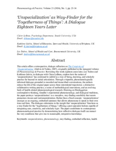 This article offers a retrospective, dialogic reflection on The Creativity of ‘Unspecialization’(Galvin & Todres, 2007), originally published in the inaugural volume of Phenomenology & Practice. Revisiting this work eighteen years later, Les Todres and Kathleen Galvin, in dialogue with Claire LeBeau, explore how the notion of ‘unspecialization’ has continued to unfold as a way of being, knowing, and scholarly practice far beyond its initial articulation. Through a tripartite, phenomenologically informed dialogue grounded in recorded and transcribed conversations, the authors retrace the life of the original paper across three interrelated trajectories: a distinctive collaborative writing practice, a series of methodological innovations, and an evolving body of health-related phenomenological research. Drawing on Heideggerian contemplative thinking, Gendlin’s experiential phenomenology, and dialogical traditions, the paper portrays ‘unspecialization’ as a receptive, way-finding sensibility that resists premature closure and instrumentalization. Rather than a fixed concept, ‘unspecialization’ emerges as an ongoing, embodied openness that allows phenomena to speak in their own time and form. The dialogue culminates in the insight that ‘unspecialization’ functions as a way-finder for the“togetherness of things,” offering a post-specialist holism capable of integrating care, creativity, and scholarly rigor. The paper contributes to contemporary phenomenological practice by demonstrating how reflective dialogue itself can reenact the very conditions that give rise to meaningful, integrative knowledge.
